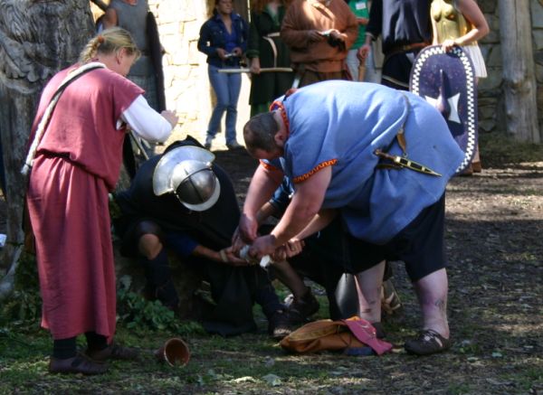 Feldarzt entfernt den Pfeil aus dem Arm des Auxilliaren